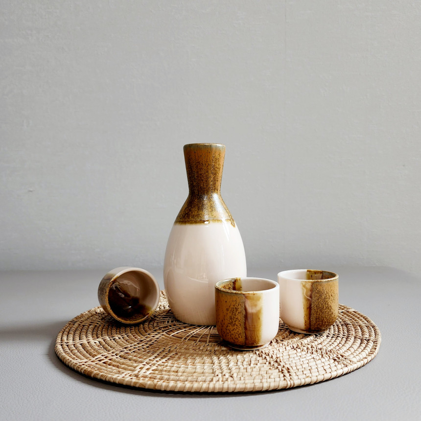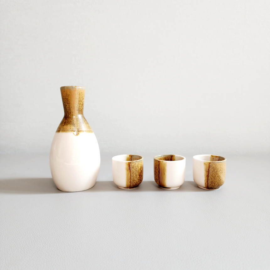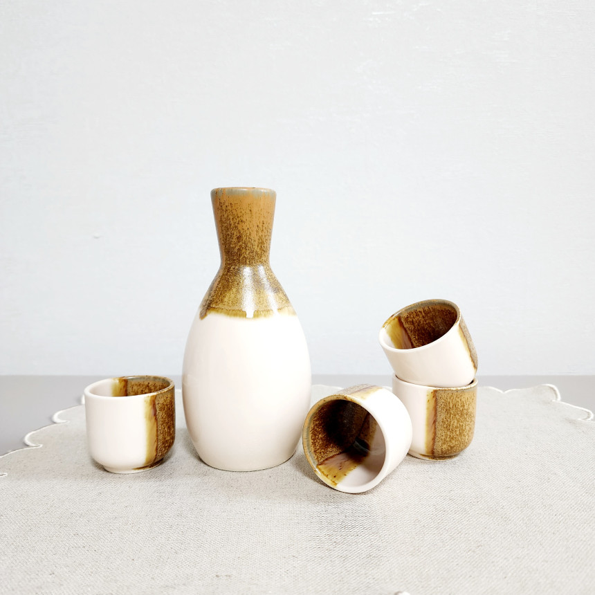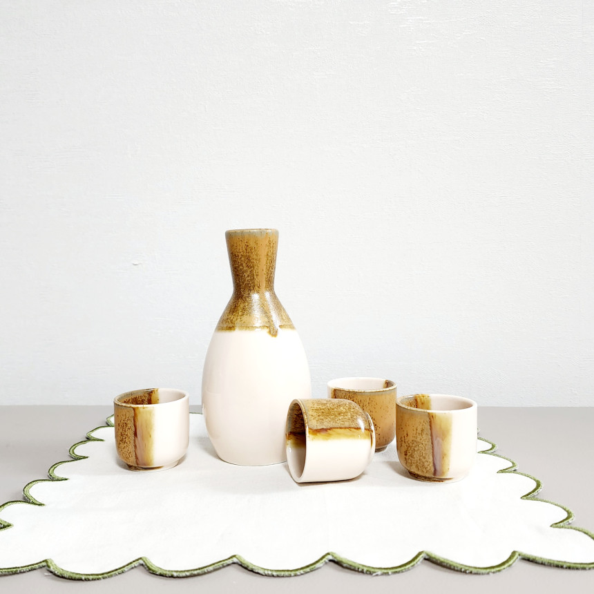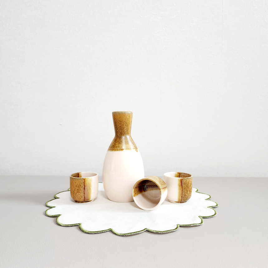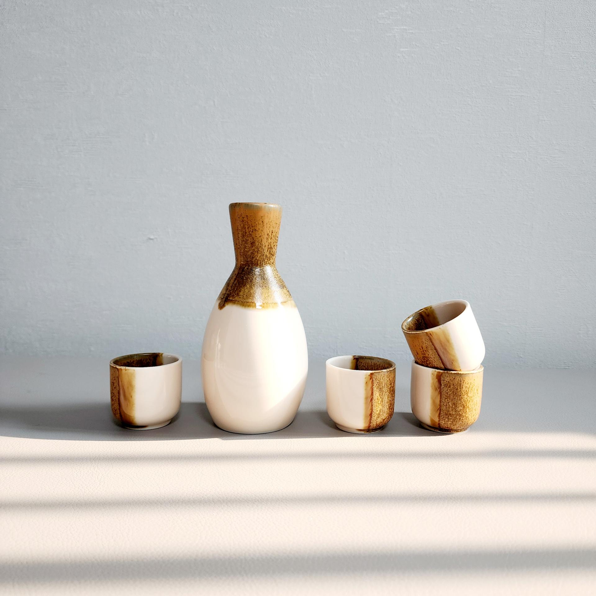 유약의 흐름이 매력적인 노을 내린 갈색 주병세트입니다.