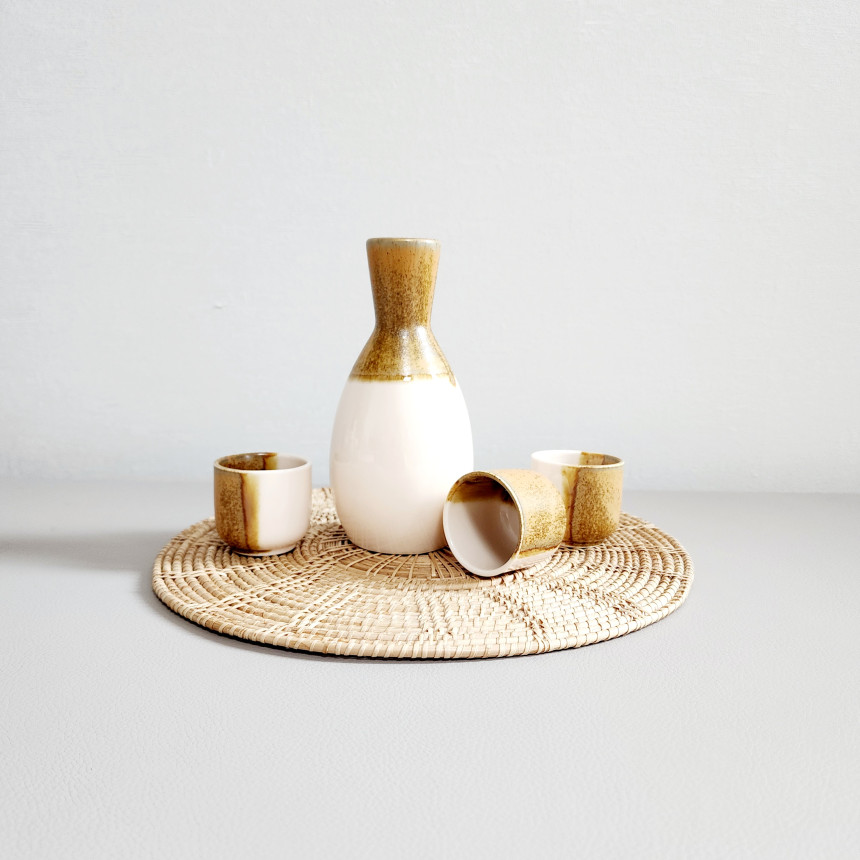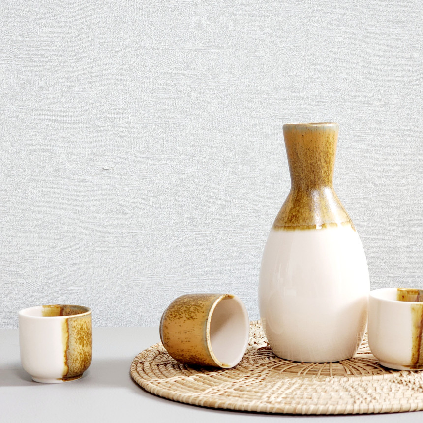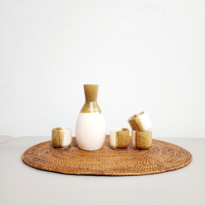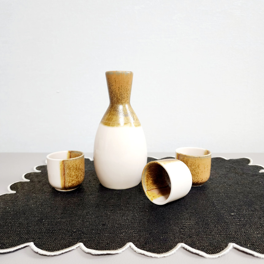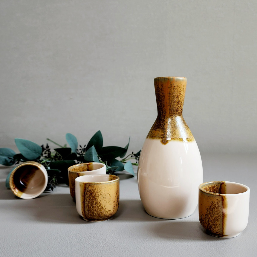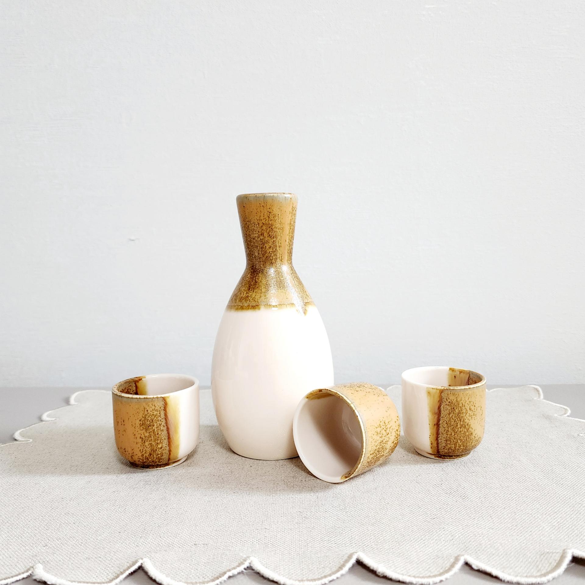 유약의 흐름이 매력적인 노을 내린 갈색 주병세트입니다.
