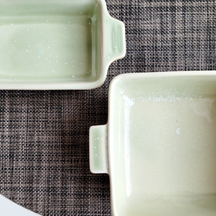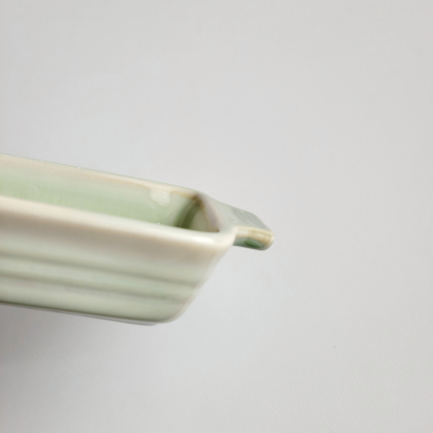 손잡이가 달린 그린 색 직사각형 탕기입니다.