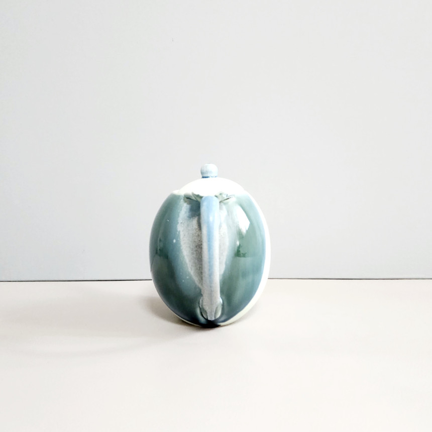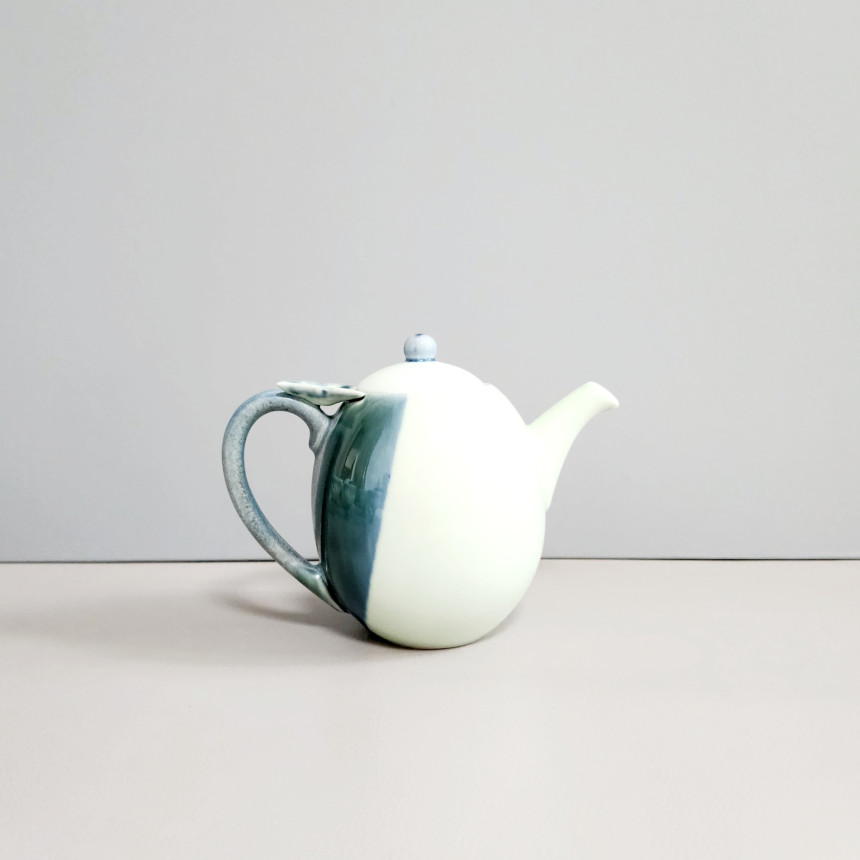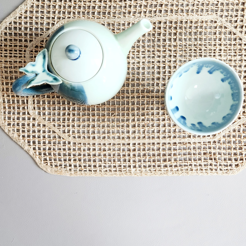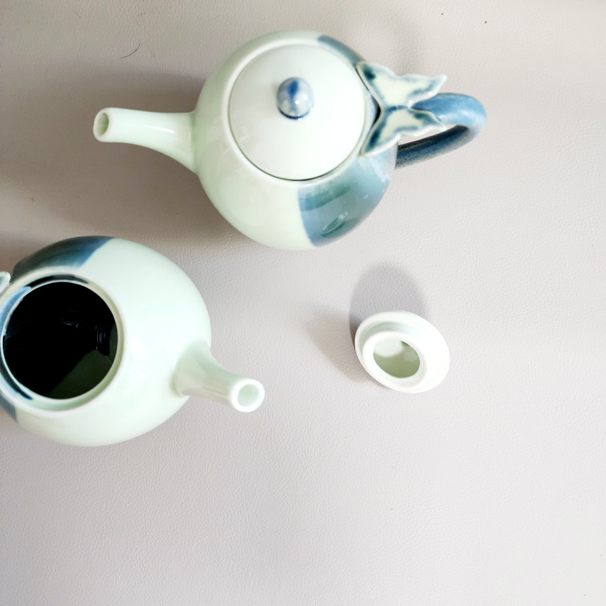 은은한 민트색 바탕에 진한 코발트블루 색 유약으로 무늬를 내었습니다.