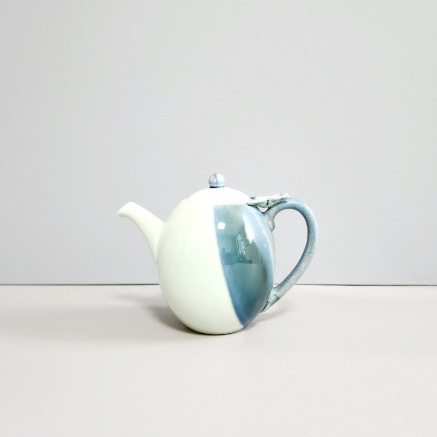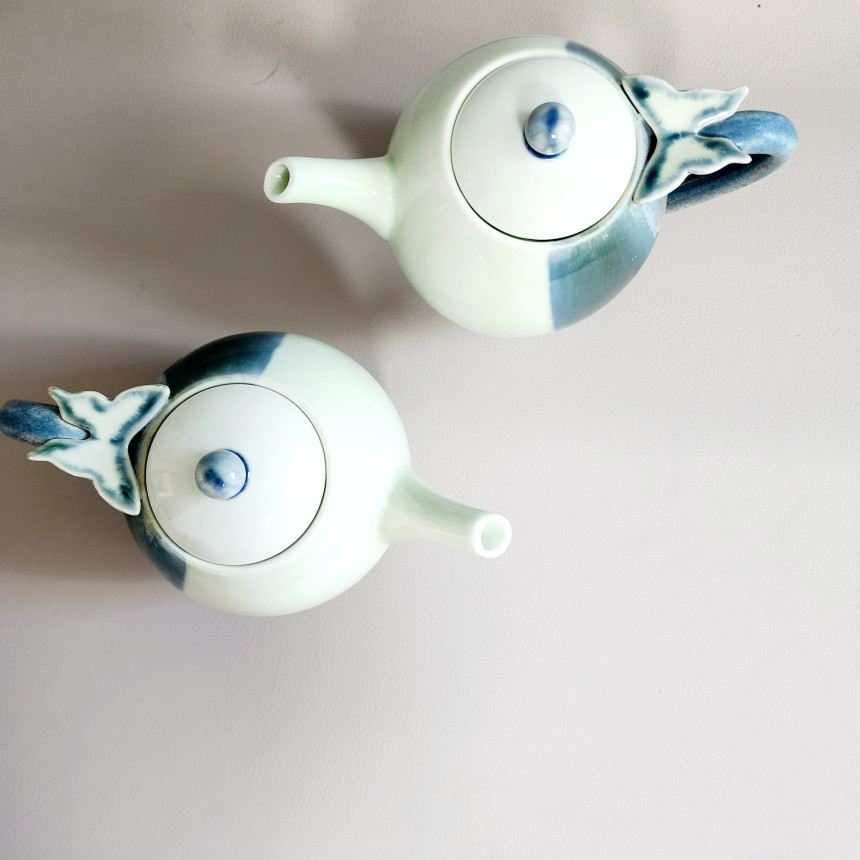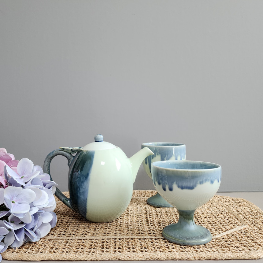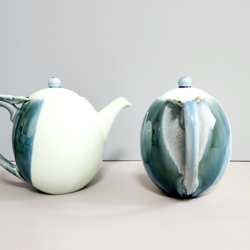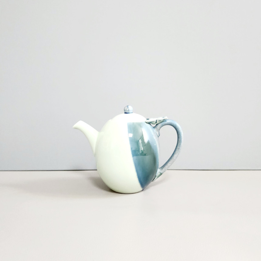 은은한 민트색 바탕에 진한 코발트블루 색 유약으로 무늬를 내었습니다.